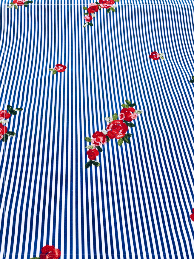 bestickter, gestretchter Baumwollstreifenstoff eines bekannten ital. Modelabels